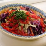 Then I just wanted to show you this salad to inspire you to do the same. There’s no recipe. But the cooking show “Celebrity Masterchef,” on the BBC had a guy on last week who did a version of this salad, and topped it with sauteed duck breast. I think I will do that tonight. Avery will have to have leftover tomato sauce and noodles, since she is anti-duck. Or rather, I’m sure she’d point out, she’s actually PRO-duck, and anti-eating-duck. Whatever. What you want is a number of crunchy vegetables, and a really sharp dressing. I sliced up purple cabbage, white cabbage, red bell peppers, and chives. Delicious and so good for you.