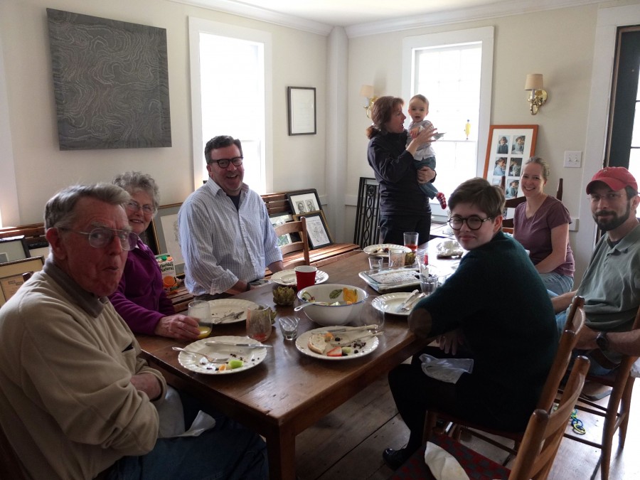 This time the cast of characters included our dearest neighbor and friend Anne, up here all by herself to accomplish some home repairs across the road, leaving dear David and Kate behind. How hard it is to wait until summer to see them! The Elder Rollie, as he must be called now that there’s not only Young Rollie but Even Younger Rollie these days, came with Judy who brought fruit salad and daffodils, as well as her beautiful smile, one of the warmest in the world. Such dear friends, all.