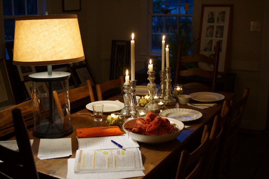 Avery has been diligently studying, or “revising” as one says in English English, for the massive exams looming over her life next month, the dreaded GCSEs. Eleven subjects, over the course of a month, to be suffered through in the school Sports Hall under the most rigorous of conditions (no sneezing has been bandied about by the exam rumor mill, for example). The dinner table this “holiday” has been taken over by her papers, files, books, pens. We cleared off a small portion for our dinners, though. Lobsters for Nonna’s last night!