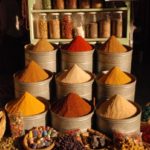 I got my wish and visited one of the spice stalls, with towering pyramids of dusky cumin, paprika, coriander, every spice you can imagine, piled in cans outside, and inside a veritable shangri-la of spices, oils, pigments, medicaments, you name it. I bought a mixture called ras el hanout, a Moroccan sort of curry powder, smelling strongly of cumin, and a bag of lemon ginger powder, a small mound of Moroccan saffron which the proprietor assured me was miles better than Indian saffron. And a jar of something called argan oil, reputed to cure everything and make it taste better at the same time.