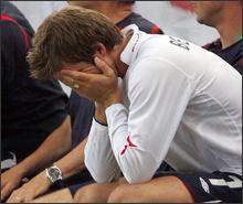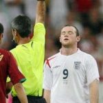 But the real drama was with these two pictured above. For one thing, David Beckham is the heart and soul of the team. An hour or so into play he was kicked, or wrenched his shin, or something, and after continuing to try to play for a few minutes, gave up and was invalided out. It was announced later that he tore his Achille’s tendon. Enough said. UNTIL the arguably most important actual footballer, Wayne Rooney, got into a tussle over the ball with two Portugal players and after completely stomping one in the groin, then went on to shove away a Portugal player who came to “help” with the referee’s decision. Result, RED CARD. It’s almost comical, the so-called “booking” process of penalization. The referee actually produces a colored card (beginning with yellow and progressing to red for a double offense) from his pocket and waves it in the air. But in this case, as when a small boy on a playground moves straight from “dare ya” to “triple dog dare ya” without the crucial “double dog dare ya” in between, the referee skipped right from neutral to red card, with no yellow card warning in between. So as punishment for a childish temper fit, Rooney was off and England were reduced to 10 men, minus as well their captain.