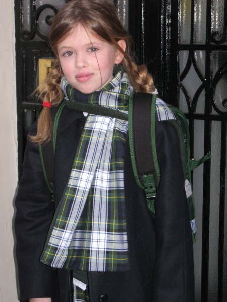 After a very fitful sleep for John and me but the sleep of the just and innocent for Avery, we got up in the dark, heard lots of lovely reports of the coming bird flu pandemic on the BBC with our breakfast. We took her to school, heartbreakingly excited and scared, and so cute in her uniform. Her little wrists looked so vulnerable without any of her beloved leather and brass pony-name bracelets, her sea glass bracelet from Maine, her inevitable hair thingys. And no earrings! But with cold knees in the morning mist, with those tiny little turn-down white ankle socks. She was greeted very nicely by Toby the secretary, and Mrs D the headmistress, and given a King’s College backpack (“not so very fashionable, lovey, but it will do the trick and hold all those pesky textbooks, now won’t it?”), then she was turned over to an impossibly poised little girl and she was gone. Mrs D assured me, “We always find it’s better just to send them off quickly, much easier all round.” I guess she was afraid I was going to follow her.