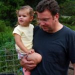As soon as Jane (and John) woke up, it was off to Rollie’s farm to see the new baby calf! She was thrilled to ride in the 1967 Land Rover we drive around in when we’re at Red Gate Farm (named Quincy). “Why does this car make such a loud noise? Our car does not make this noise. Whoa!” was her running commentary in the five minutes or so it took to go around the hill to see the animals. She was a bit skeptical of the calves’ licking her hands as they did Avery’s, but was quite captivated by being held at arm’s length and watching. “Where are the piggies?” she asked Young Rollie, but he shook his head. “We don’t have pigs, sorry,” and she learned instantly from this to phrase her next question differently. “Do you have any sheep?” Yep, sure enough, there were sheep and lambs. “Where are the dog and the cat?” And just then Judy came out of the house with Max the golden lab and Mr. B the grotty old white tomcat. Heaven. Typical John tormented the dog by pretending to throw the nasty dripping tennis ball for him, and finally Jane insisted that he throw it for real.