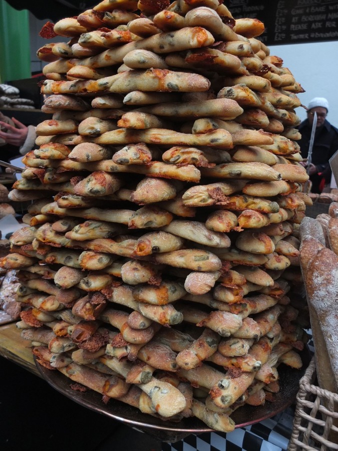 Once we’d had our fill of imagining the future, we sauntered along the river to Borough Market, which amazingly will be my local food purveyor when we eventually move into our new home. John groans in dismay at the dent this will make in his wallet, as I simply cannot resist the lure of the butchers (a plump duck came home with me), the cheesemongers (a quite magical sheep-goat Robiola, yum yum), the bakers. Check out these garlic and olive breadsticks.