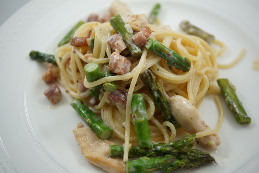 Spaghetti Carbonara with Asparagus and Chicken