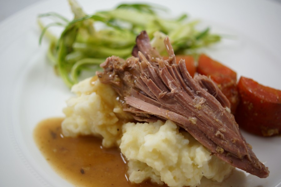 Simply tear the meat apart with two forks. The meat will fall off the bone. Serve with the gravy or homemade mustard, or both. The lentils, onions and carrots will still be edible, as well, although very soft.