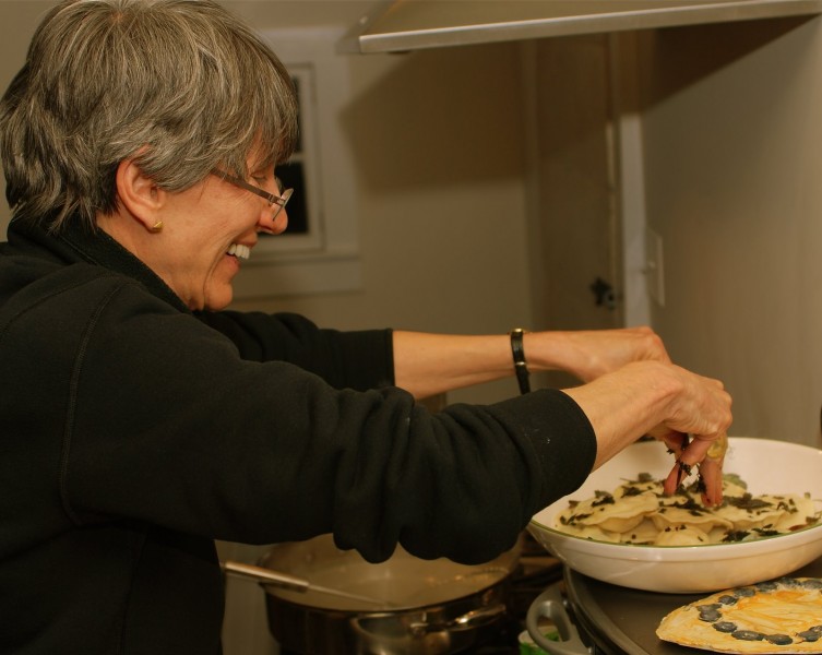 In a welter of flour, garlic, boiling lobster, claw crabmeat, celery salt from Wales and the last throes of Christmas music, we made fresh ravioli: one batch of lobster and crab flecked with lemon zest and sea salt, and one of spinach, ricotta, Canadian bacon dice and nutmeg. With a sauce of browned butter and fried whole sage leaves, two and a half hours later we sat down to a huge platter of ravioli and proceeded to devour it ALL within fifteen minutes. Slightly out of proportion to the effort it took, the meal was hilarious and happy and short, and we were in heaven. Altogether one of the happiest, most frantic, laughing and creative evenings ever, spent the way I like it: with my best cooking companion in Rosemary and a mad spirit of energy pervading over all. At the very end John got in on the action, making tagliatelle of the leftover dough and laughing with childhood memories of pasta extravaganzas… a completely happy night.