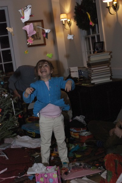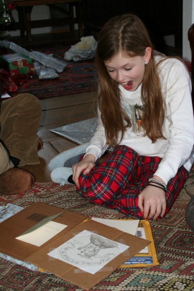 Part of the delight of the holiday has been the success in giving the right gift to the right person. Our big gift to Avery was an original illustration from her favorite book ever, “The Mysterious Benedict Society.” After much laborious and (I must say) annoying correspondence with the illustrator’s agent in Seattle, we managed to arrange for what I thought would be her favorite illustration, to be sent to my sister in Connecticut, and here it was. And although most of our friends thought we had lost our tiny minds to give such a gift (“why would she care?” being the most frequent response), she was in HEAVEN. Just in awe. The hand of the artist! And a hand-written thank-you note to go with it. Heaven.